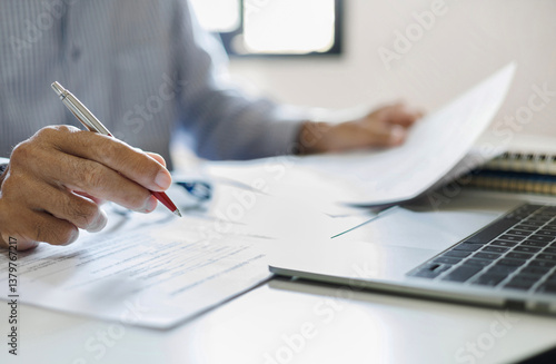 close-up shot, asian businessman reviewing document at office workplace with computer laptop. legal expert, professional lawyer reading and checking financial documents or insurance contract