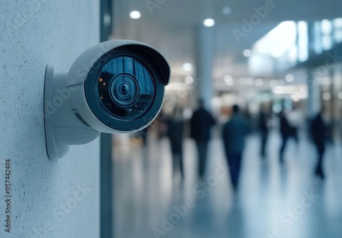 Closeup shot of a CCTV camera on the wall in a modern office building with people walking around