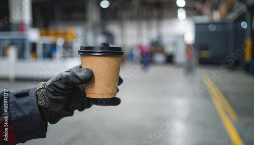 Close-up shot of a gloved hand holding a disposable coffee cup in an industrial setting. The cup has a black lid and a brown paper sleeve.
