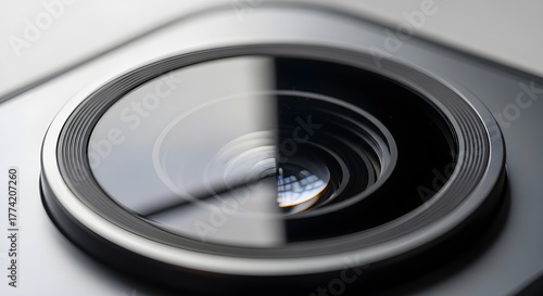 Close-up shot of a modern smartphone camera lens with bright reflection. Represents mobile photography, technology, privacy, and security concepts.