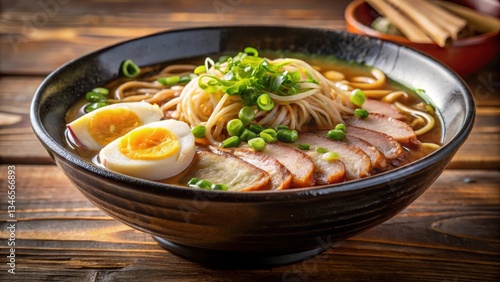 Close-up shot of a steaming bowl of Japanese ramen noodles with rich tonkotsu pork broth, topped with sliced scallions and a sprinkle of grated ginger , ginger, broth