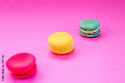 Close-up shot of colored macaroons in different position