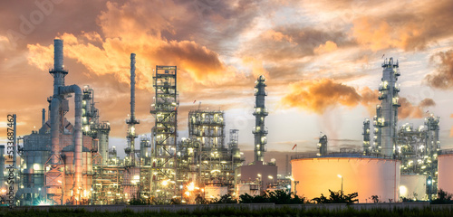 Close-up shot of oil and gas refinery Device details Steel oil pipeline with valve from a large oil storage tank in the sunset sky-image