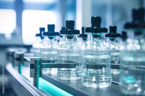Close-up shot of Pharmaceutical machine working pharmaceutical glass bottles production line