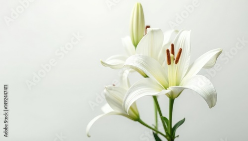 Close-up shot of pristine white lilies on stark white backdrop, lily, delicate