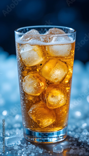 Close-Up Vertical Photo of Glass with Carbonated Amber Beverage and Ice Cubes