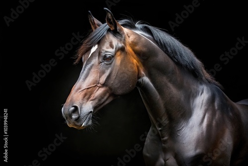 Close-up vertical shot of a black horse on a black background