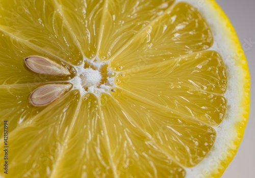 Closeup vibrant yellow lemon slice juicy texture seeds healthy food photography