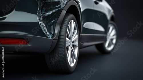 Close-up view of a damaged vehicle's rear quarter panel, highlighting the collision impact.