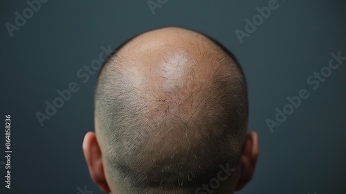 Close-up view of a man's bald spot on the back of his head.