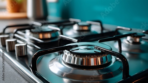 Close-Up View of a Modern Gas Stove with Chrome Knobs and a Vibrant Blue Kitchen Background