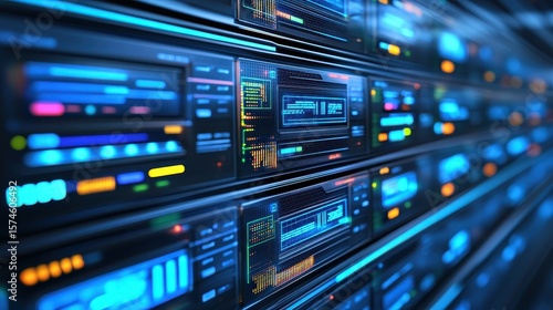 Close-up view of a server rack with illuminated panels.