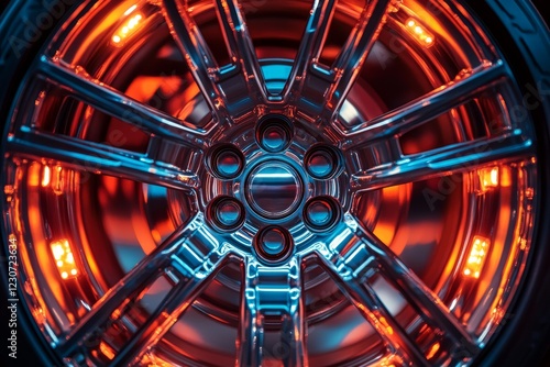 Close-up view of a shiny car wheel illuminated by vibrant red and blue lights at a nighttime automotive event