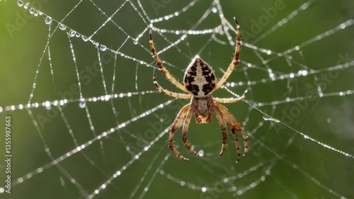 Close-up view of a spider sitting on its web. Detailed shot of the spider and its silky web in nature.