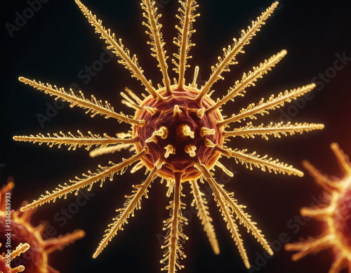 Close-up view of a vibrant microscopic organism with intricate structures against a dark background. Generative AI