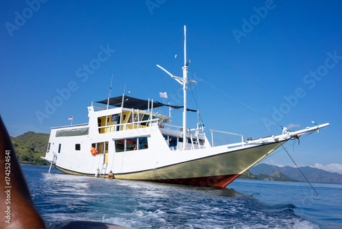Close-up view of a white and yellow wooden boat anchored in calm blue waters under a clear sky near Komodo, Indonesia. Perfect for travel advertising, maritime lifestyle, and summer adventure visuals.