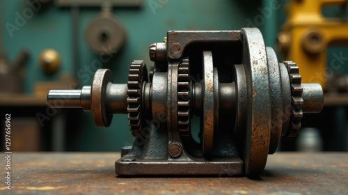 Close-up view of an aged, industrial gear mechanism resting on a weathered metallic surface, showcasing intricate details of its rusted components and robust construction.