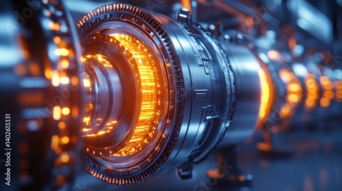 Closeup view of an intricate highly engineered metallic with a complex array of glowing futuristic mechanisms and patterns showcasing advanced precision engineering and technological innovation