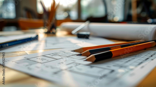Close-up view of architectural blueprints with pencils and tools on a work desk, highlighting detailed planning.