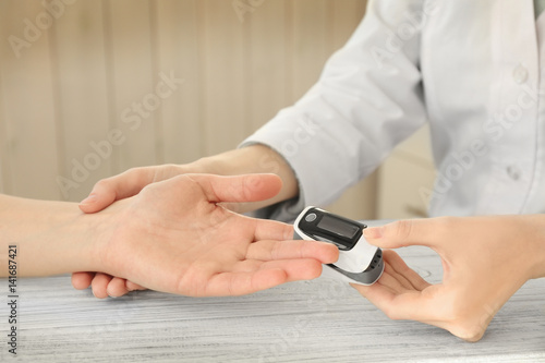 Closeup view of doctor examining woman with heart rate monitor