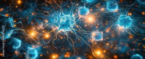Close-up view of glowing blue neurons interconnected with bright orange synapses signaling activity in a neural network