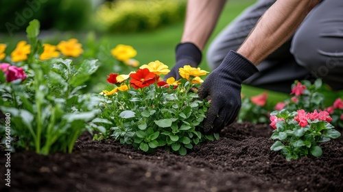 Closeup view of hands of gardener working in field planting flowers.