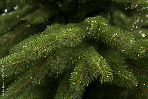 Close-up view of lush green pine tree branches with fine needles, showcasing their texture and vibrant color.