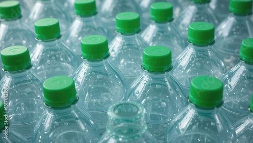 Close-Up View of Multiple Green-Capped Plastic Water Bottles in Organized Arrangement