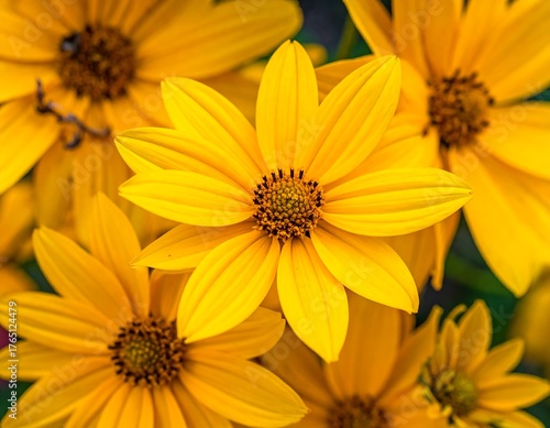Close-up view of multiple vibrant yellow wildflowers, with intricate details