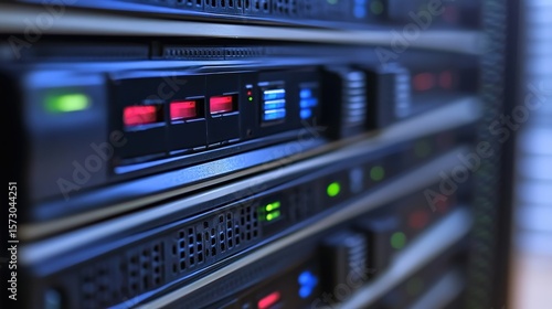 Close-Up View of Network Server Rack with Active LED Indicators Showcasing Data Storage Components and Cooling System in a Modern Data Center Environment