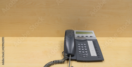 Closeup view of old style wired desktop telephone - studio shot