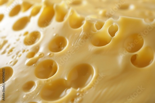 Close-up view of Swiss cheese with characteristic holes, showcasing its texture and creamy yellow color. Perfect for culinary and food-related concepts.