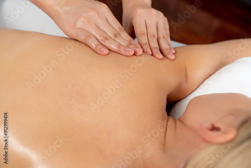 Closeup woman customer enjoying relaxing anti-stress spa massage and pampering with beauty skin recreation leisure in day light ambient salon spa at luxury resort or hotel. Quiescent
