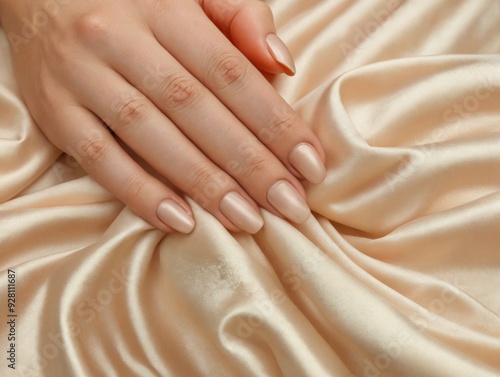 Close-up woman hand resting beige satin fabric Glamour woman han