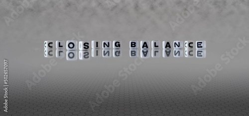 closing balance word or concept represented by black and white letter cubes on a grey horizon background stretching to infinity