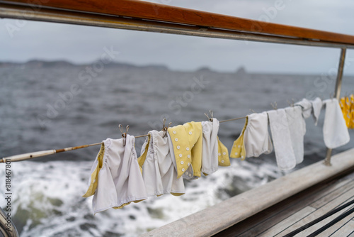 clothes drying on a washing line on a yacht boat traveling over the ocean on holiday. nappies drying on a clothesline in new zealand