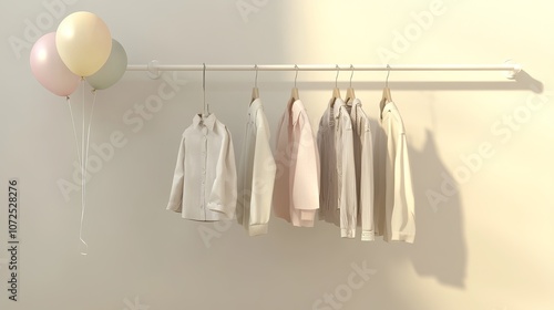Clothes on a hanger and shelf with a balloon on a cream background clothes on rack in neutral beige tones 3D rendering for shopping store or bedroom concept