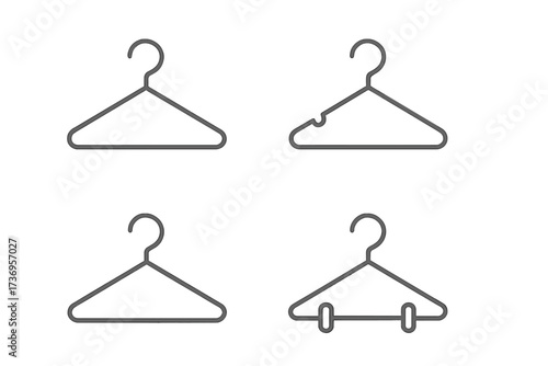 Clothing hanger line icon set. Editable stroke vector pictogram pack. Minimalist clothes rack and hook for wardrobe, fashion, or laundry. Apparel storage cartoon illustration.