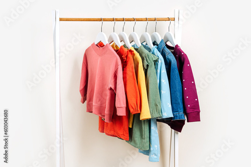 Clothing Rack with children's outfits close up. Fashion clothes in rainbow colors on hangers in wardrobe. Kids wardrobe. Set of kids clothes and accessories.