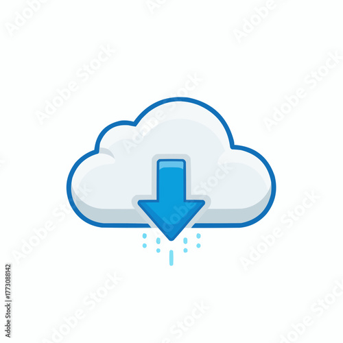 Cloud download icon with blue arrow pointing down and small particles falling from the cloud