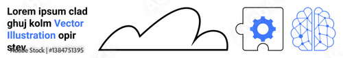 Cloud outline, puzzle piece with gear representing system integration, neural network design for AI. Ideal for technology, machine learning, connectivity, innovation, systems, problem-solving simple