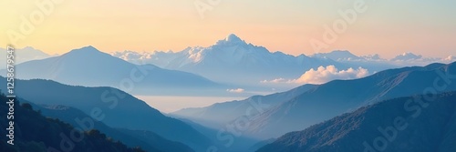 Cloud-draped mountain slopes bathed in warm sunlight, cloud, blue, dawn
