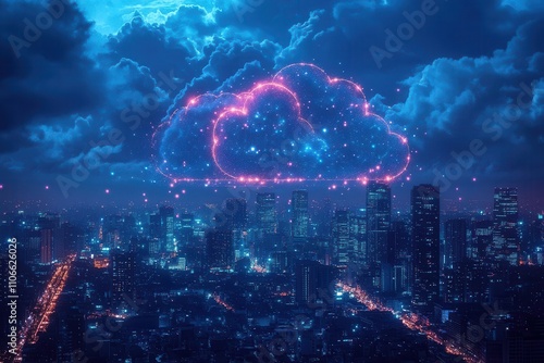 clouds forming a digital network above a city skyline, with glowing nodes representing data connections and a modern aesthetic reflecting the significance of cloud computing technology