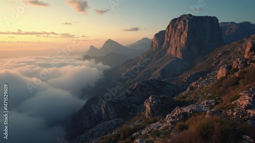 Cloudy dawn over Roque Nublo captured in a soft panoramic mountain view.