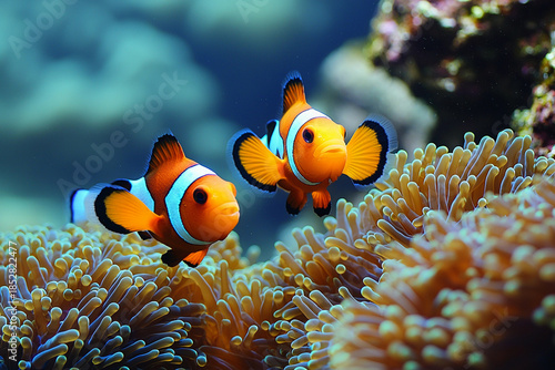 Clownfish swim in coral reef at bright tropical location Generative AI