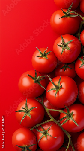 Cluster of fresh tomatoes on a red background