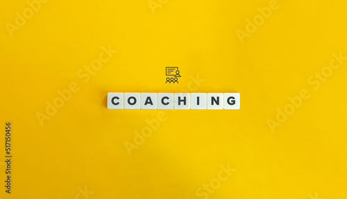 Coaching Banner. Word on Block Letter Tiles on Yellow Background. Minimal Aesthetics.