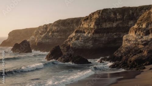 Coastal Cliffs and Ocean Waves Under a Golden Sunset.