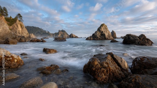 Coastal Landscape, Ocean, Long Exposure. Serene scenic seascape with rocks and cliffs at dusk. Tranquil, nature photography.