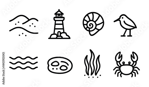 Coastal line icons set – outline style beach, sea life, and nautical symbols for ocean themes: waves, lighthouse, seashell, shorebird, seaweed, sand, crab, rockpool.